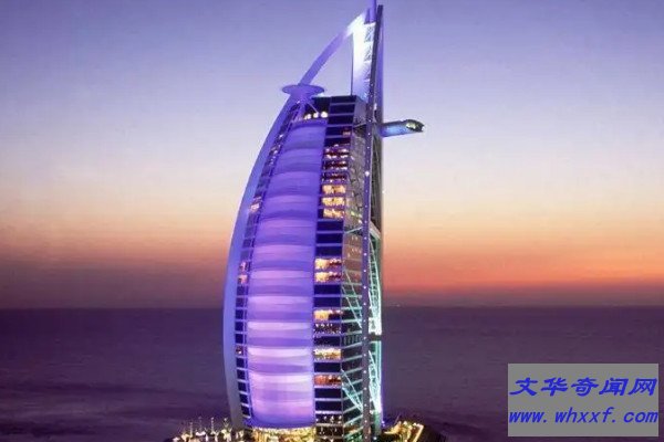 阿拉伯塔酒店是迪拜最具标志性的建筑之一,其外形与帆船相似,所以也被称为迪拜帆船酒店。酒店建在离沙滩岸边280米远的波斯湾内的人工岛上,一共有56层,高度为321米,每天住宿的费用约1万人民币。